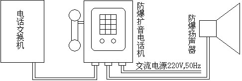 該防爆擴音電話機與防爆揚聲器(防爆喇叭)組成防爆擴音電話站。該防爆擴音電話站使程控電話交換機的用戶實現了擴音呼叫的目的。該擴音防爆電話機與電話交換機連接,也可與調度指令電話交換機連接。防爆擴音電話機的兩根信號線接電話交換機(或其它調度機)的一對用戶線;兩根電源線接交流電源;揚聲器輸出端子接防爆揚聲器,其擴音輸出功率在30W以下連續可調。